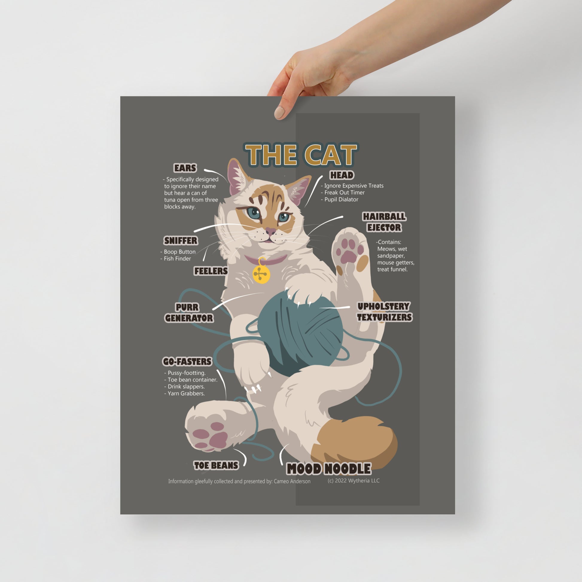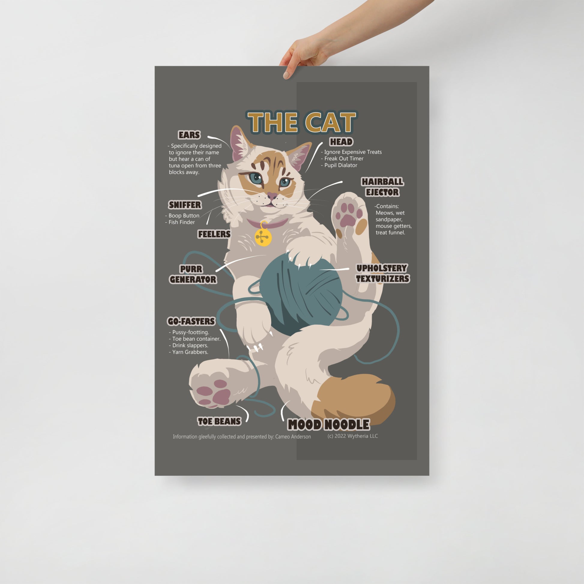 If the world was flat, the cats would have knocked everything off of it by now - right? Well, this funny poster is a delightfully immature homage to the house cat. Anatomy and personality lampooned for the entertainment of cat lovers (and maybe people who don't like cats that much, too) in this simple but fun cartoon meme art by Cameo Anderson.